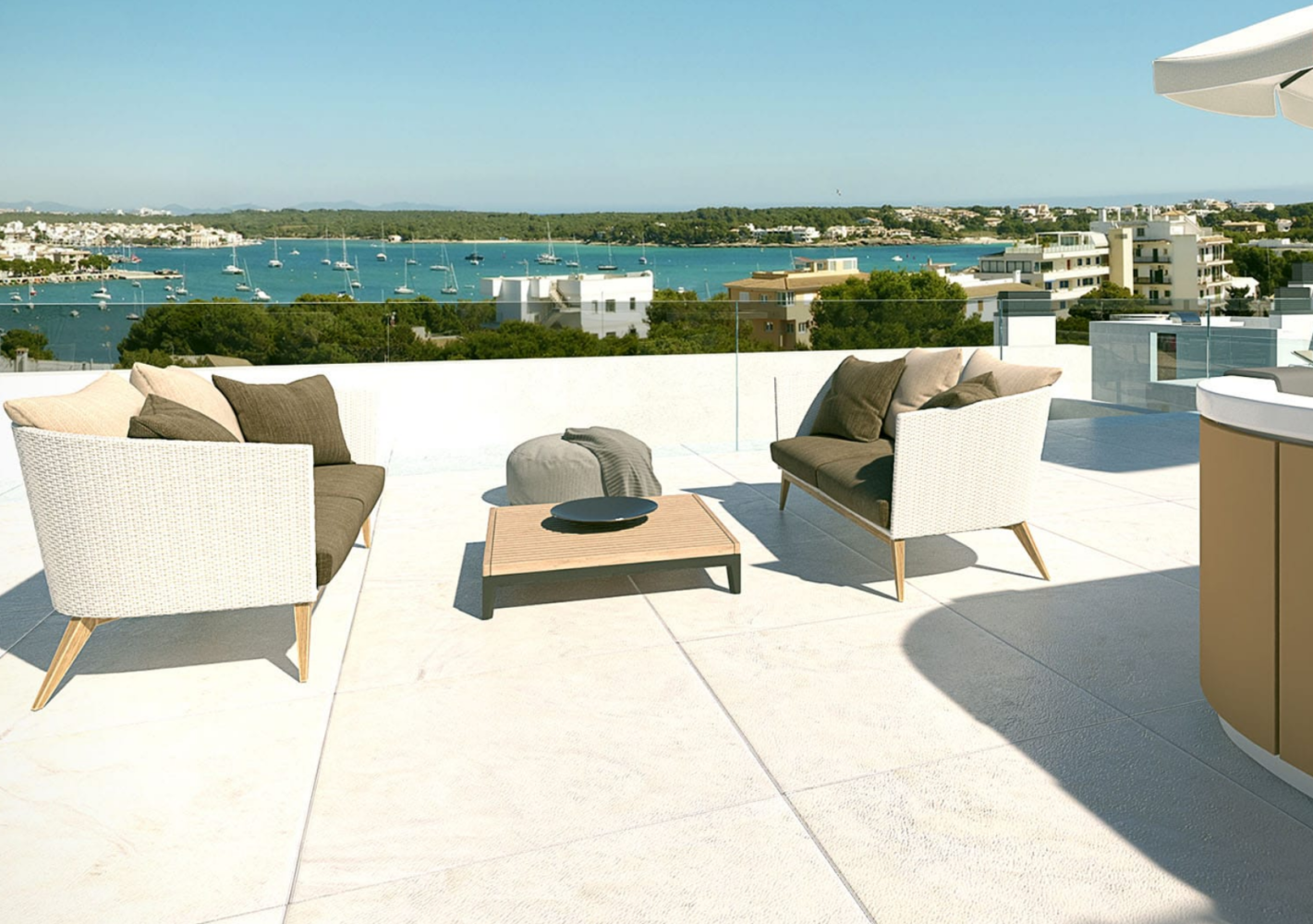Es Far de Portocolom offers 2 bedroom apartments with 1 or 2 bathrooms, and 3 bedroom with 2 bathrooms. The tipology of properties include: ground floors with garden and direct access to the pool area, penthouses with top terraces fitted with barbecue and pre-installation of jacuzzi and, first floor appartments with big terraces. All of them are characterized by their excellent floorplan, spacious rooms and premium qualities such as cold / heat air conditioning by aerothermy . The urbanization also has an independent villa with double height living room, private pool with garden, and garage. The villa’s top quality finishes include underfloor heating throughout the house, pre-installation of a wood-burning fireplace and osmosis in the kitchen.