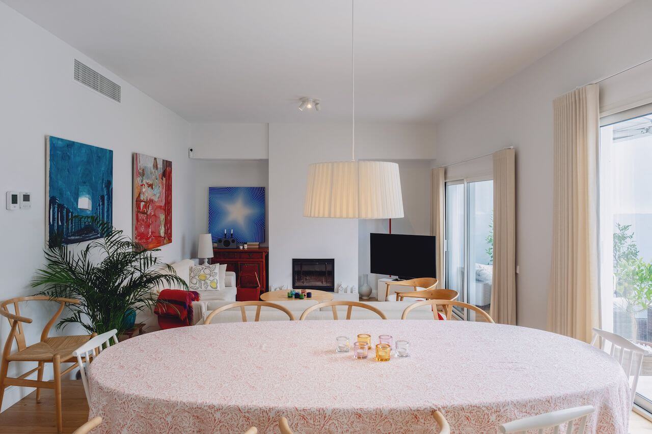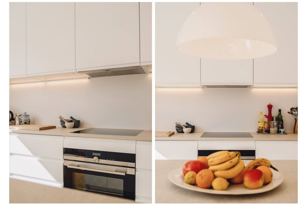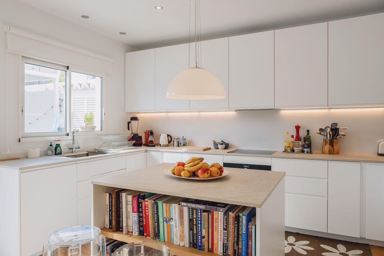 Upon the entrance, you’re welcomed by the lovely flow of modern open living; the kitchen, dining and living room with an elegant design – all open-plan. The big sliding glass doors lead to the terrace with a BBQ and a dining area, perfect for socialising. The pool area, with an outdoor shower and cosy sunbathing space, invites you to enjoy the island’s warm weather and the sun throughout the day.