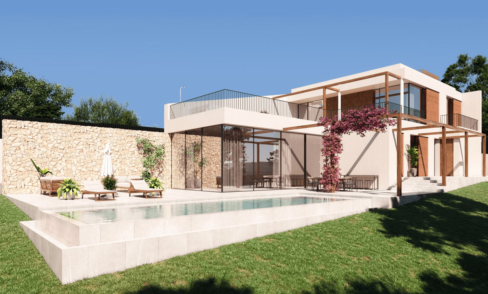 Villas Falcó are being built to the highest standard, using top quality materials and luxurious finishes. Each villa spreads over two floors with several terraces and outdoor spaces as well as a private pool. There are four bedrooms and five bathrooms in each villa and large social spaces as well as underground garages.’