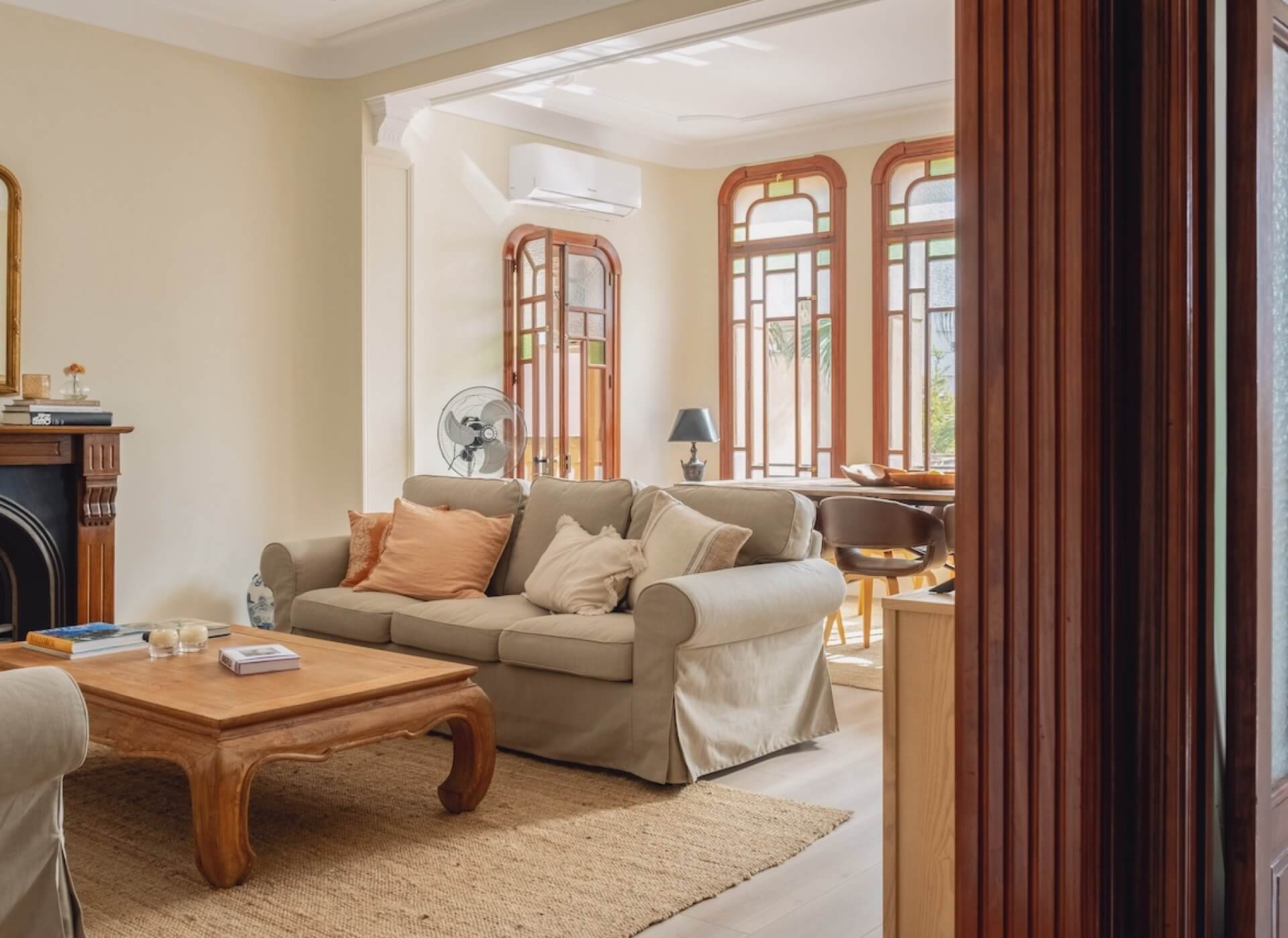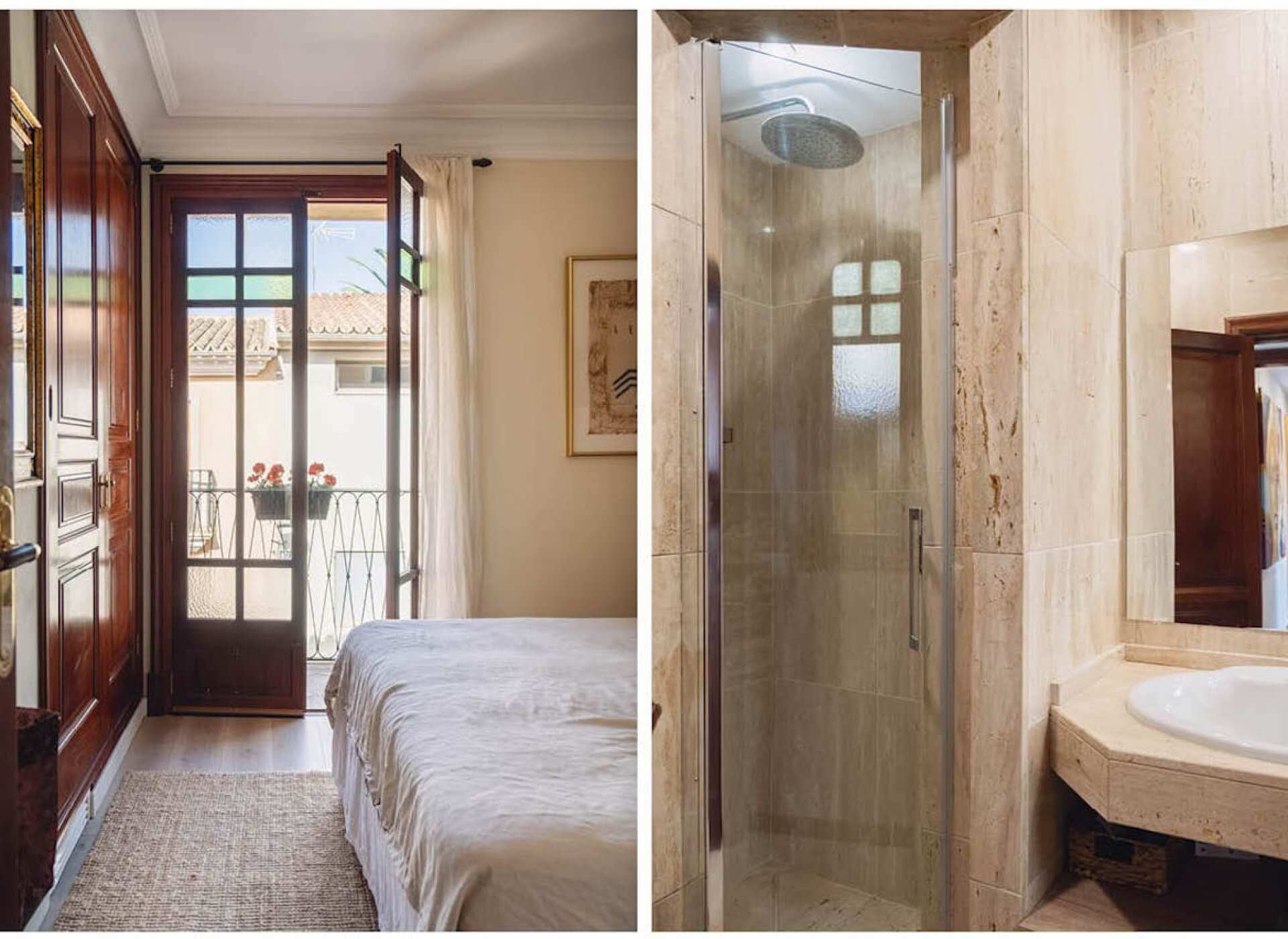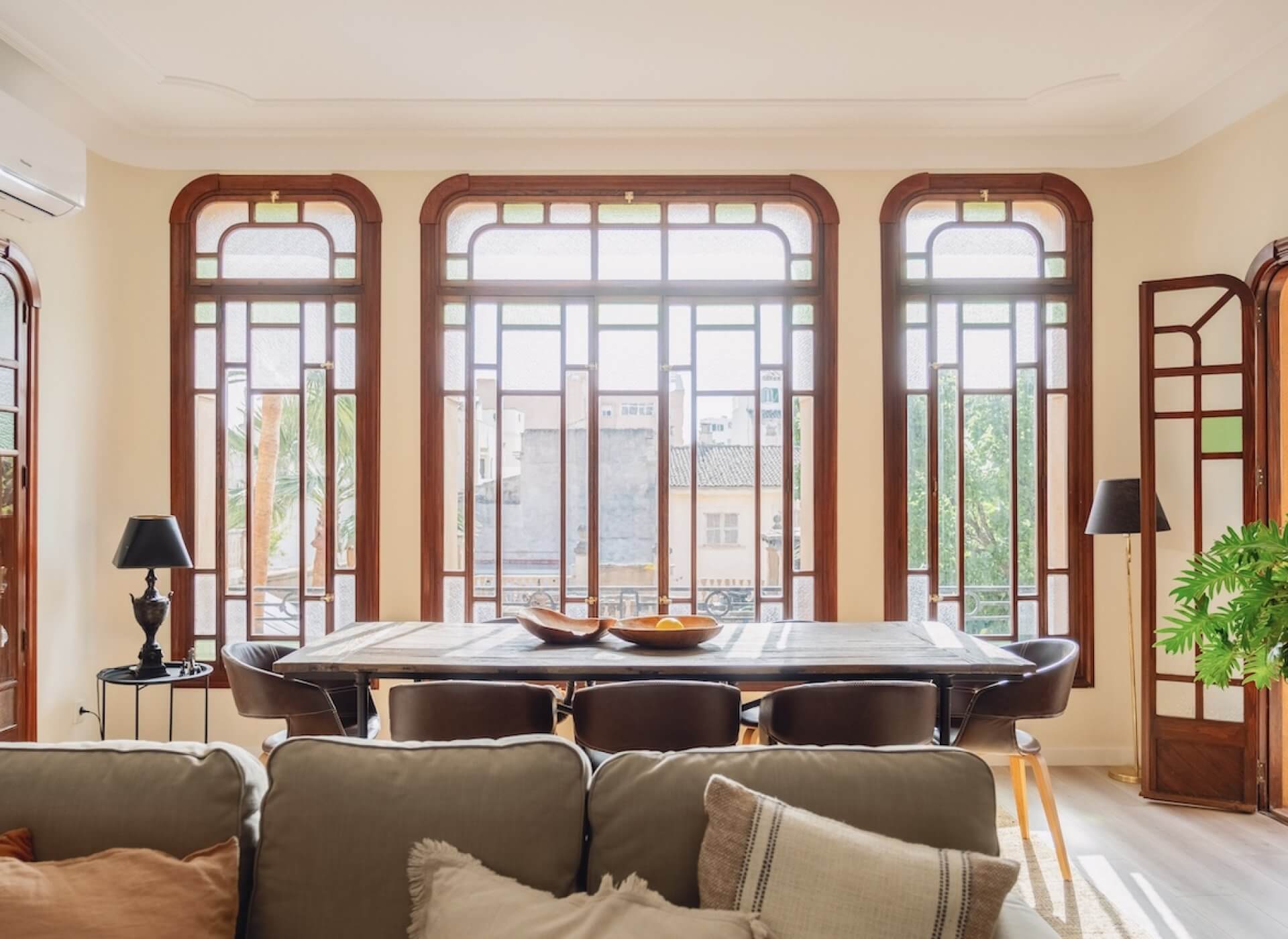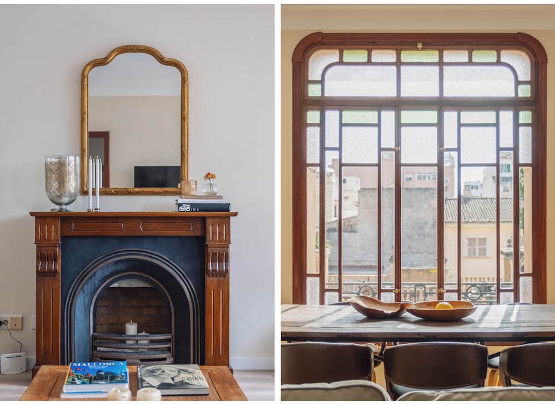 As you step inside, you’re welcomed by the bright living/dining area with a fireplace and high ceilings. The unique large Mallorquin glass windows are bathing the apartment in natural light, creating a very elegant and authentic ambience throughout.