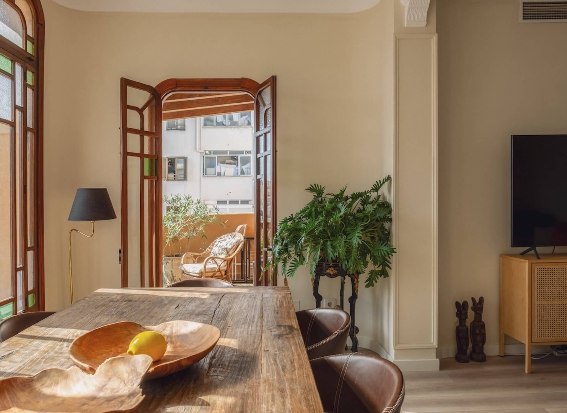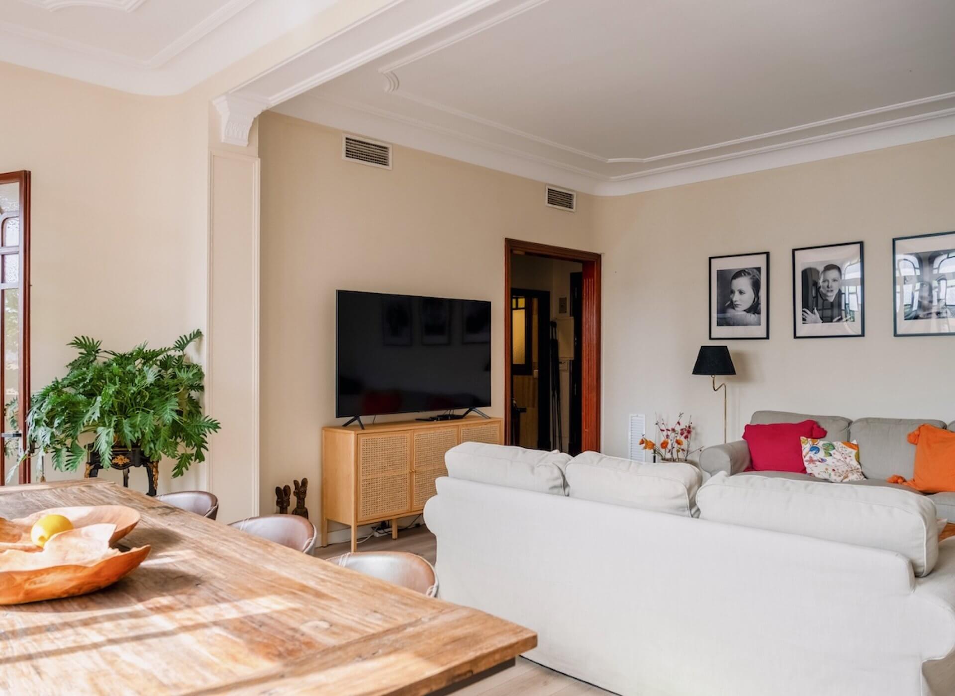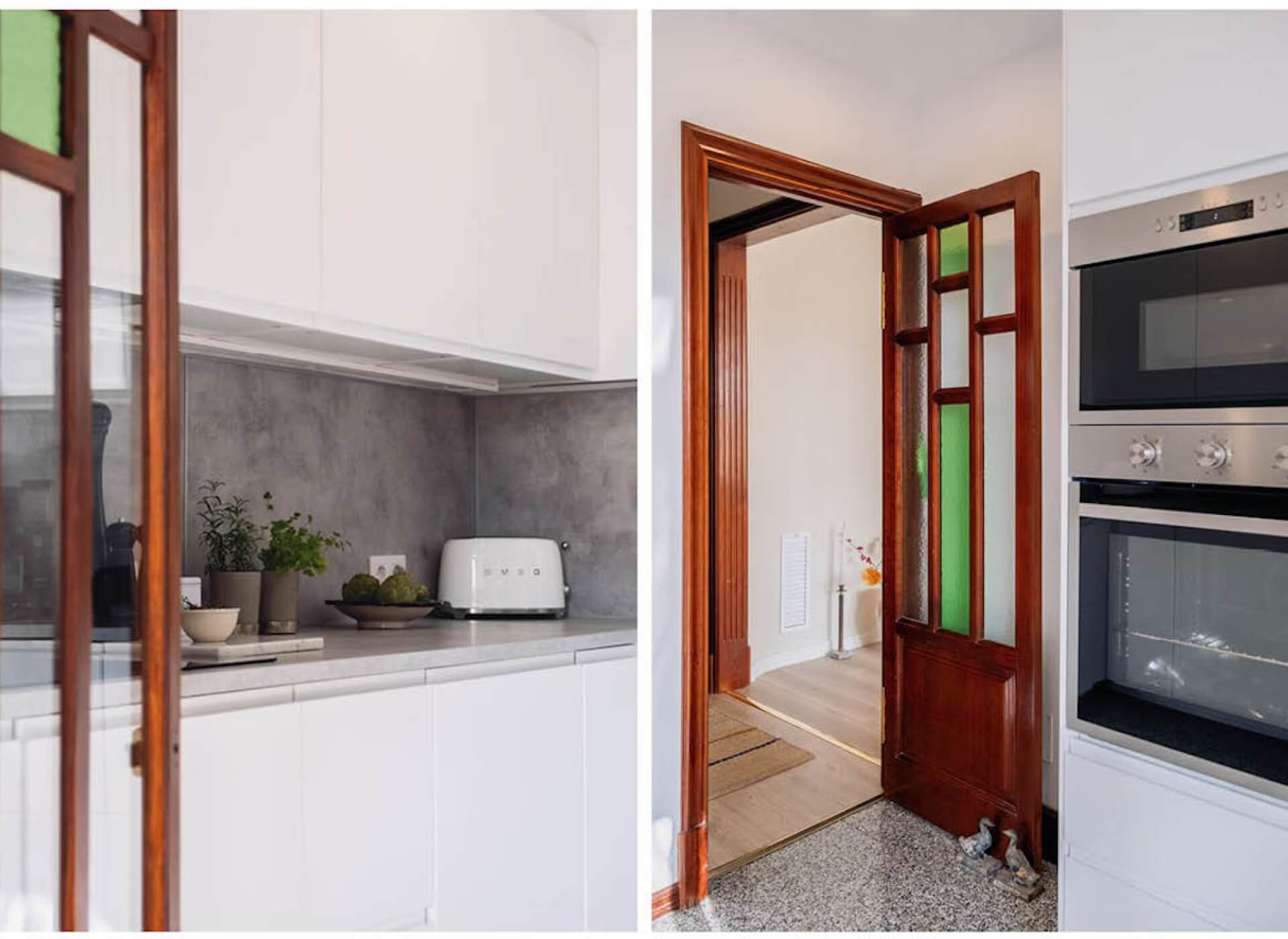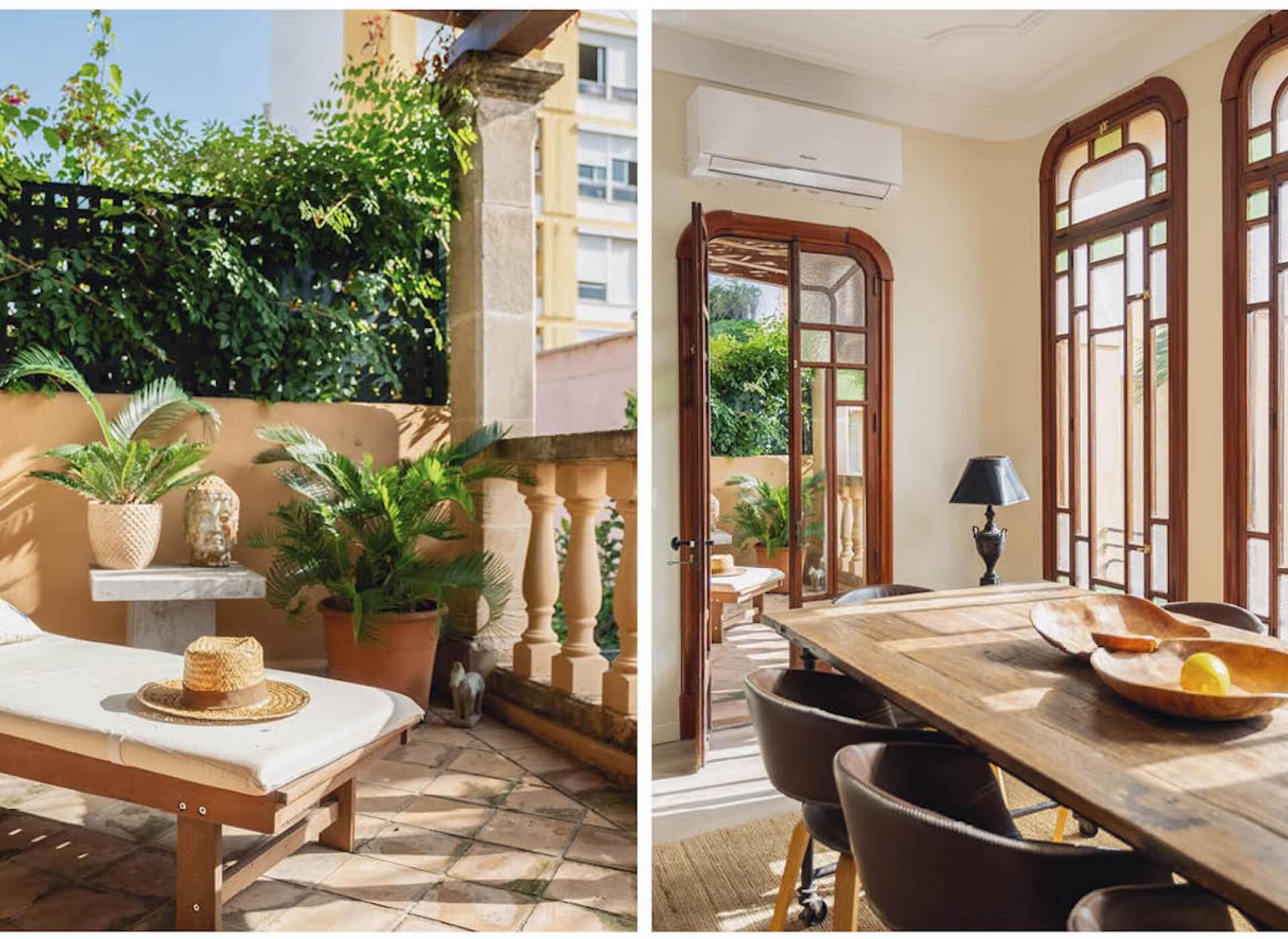 As you step inside, you’re welcomed by the bright living/dining area with a fireplace and high ceilings. The unique large Mallorquin glass windows are bathing the apartment in natural light, creating a very elegant and authentic ambience throughout.