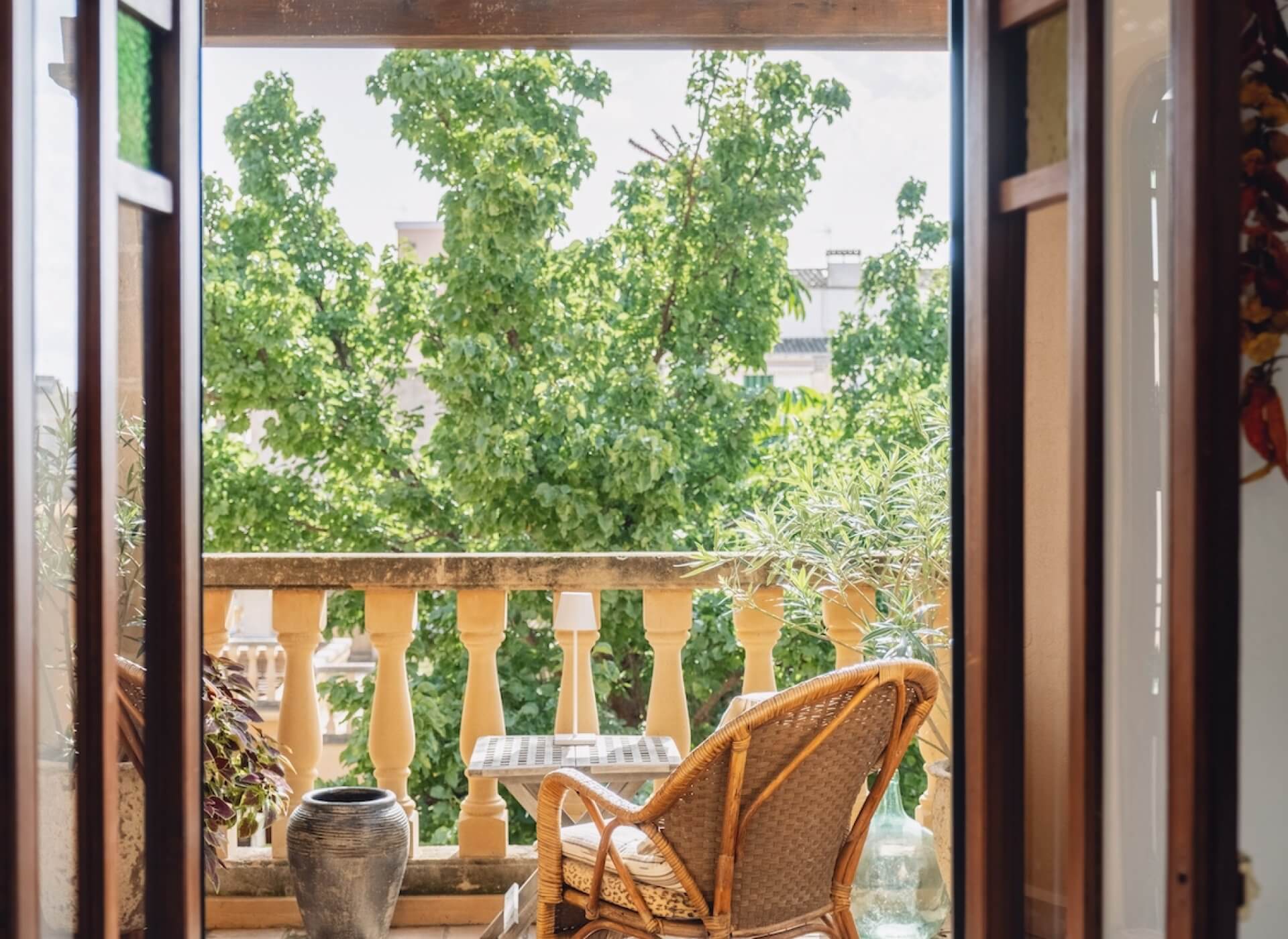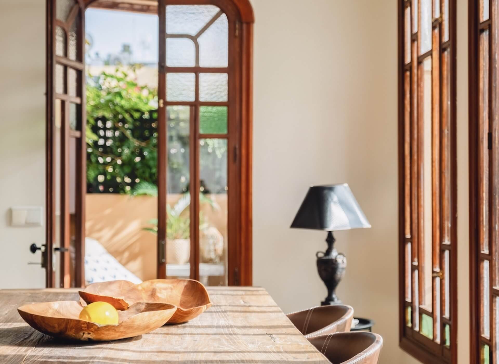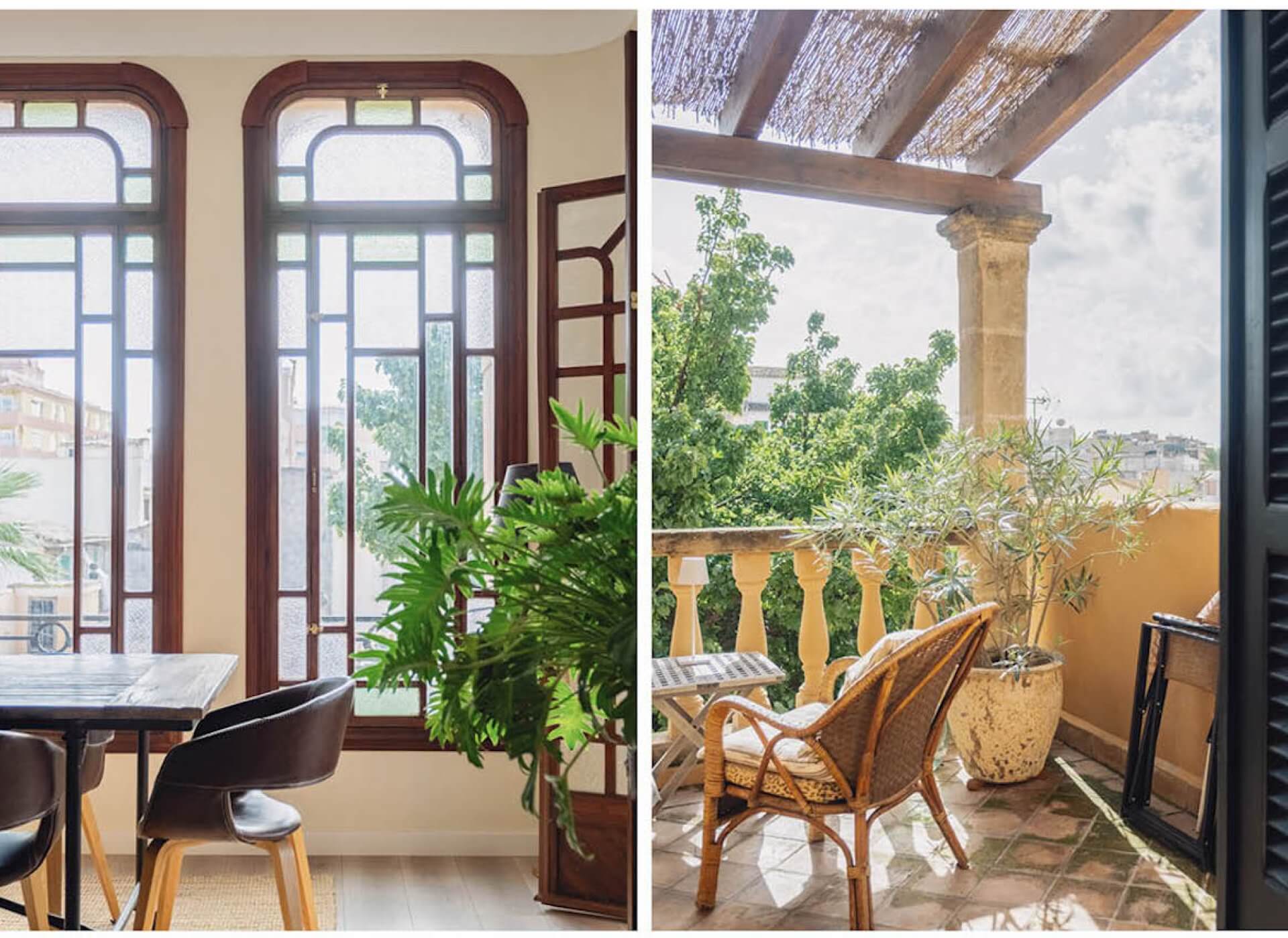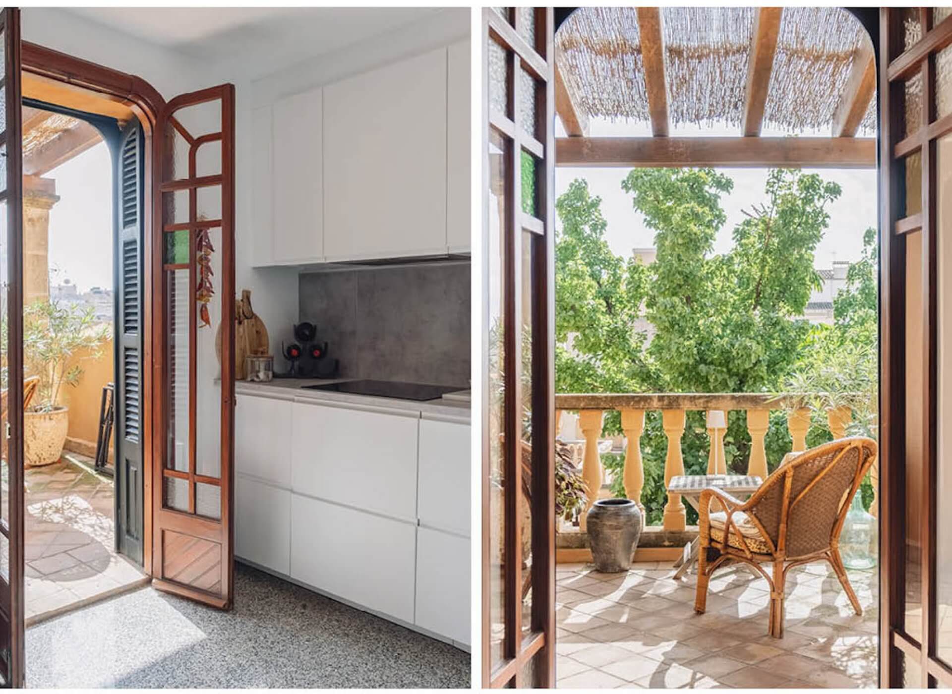 As you step inside, you’re welcomed by the bright living/dining area with a fireplace and high ceilings. The unique large Mallorquin glass windows are bathing the apartment in natural light, creating a very elegant and authentic ambience throughout.