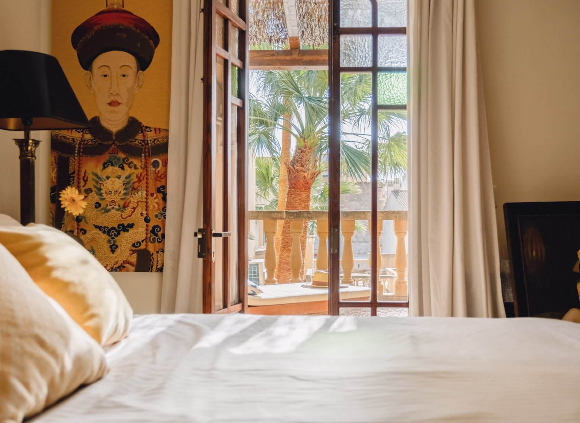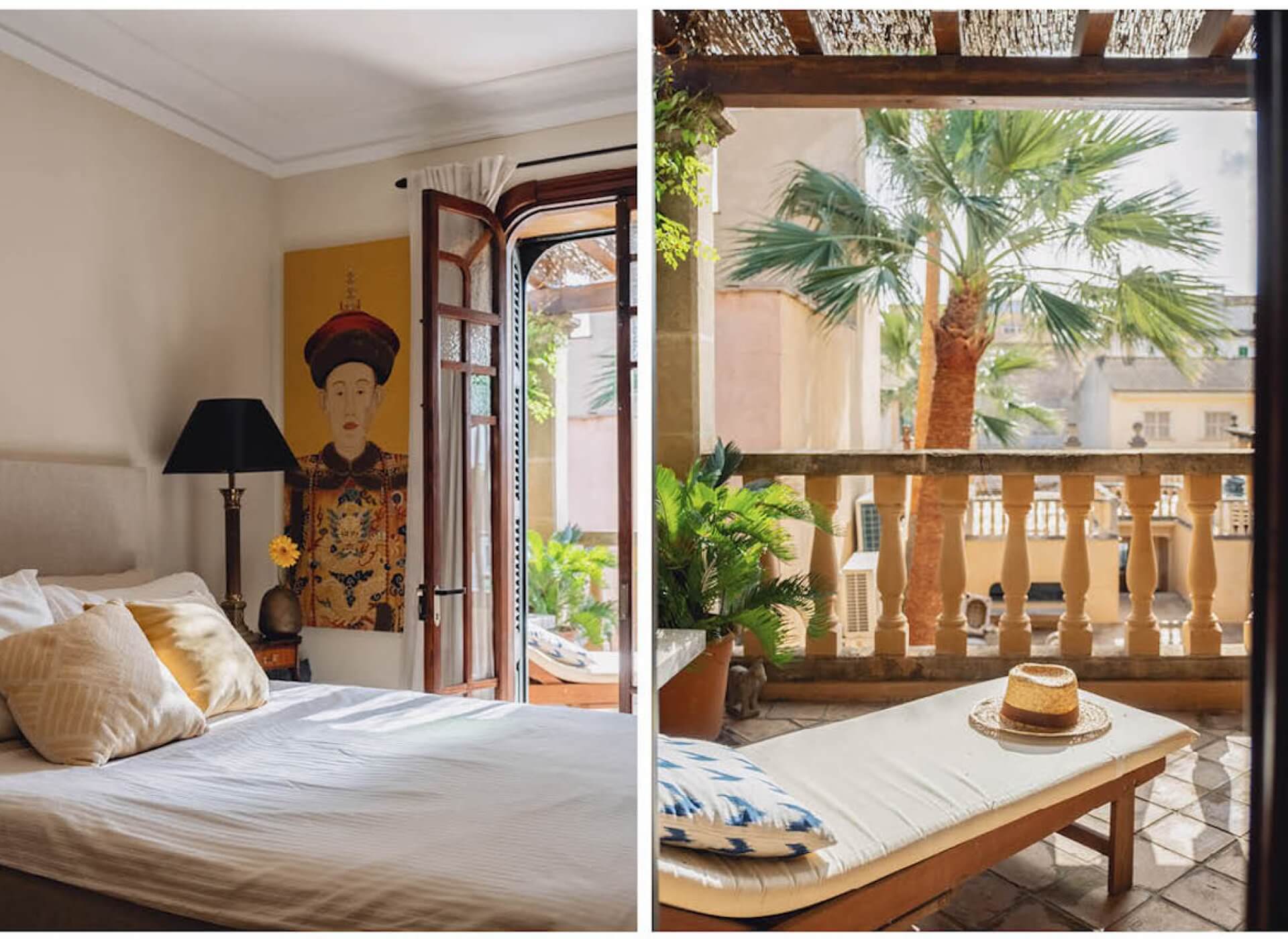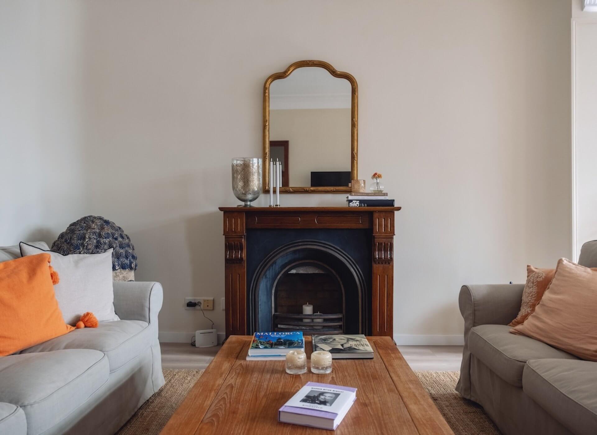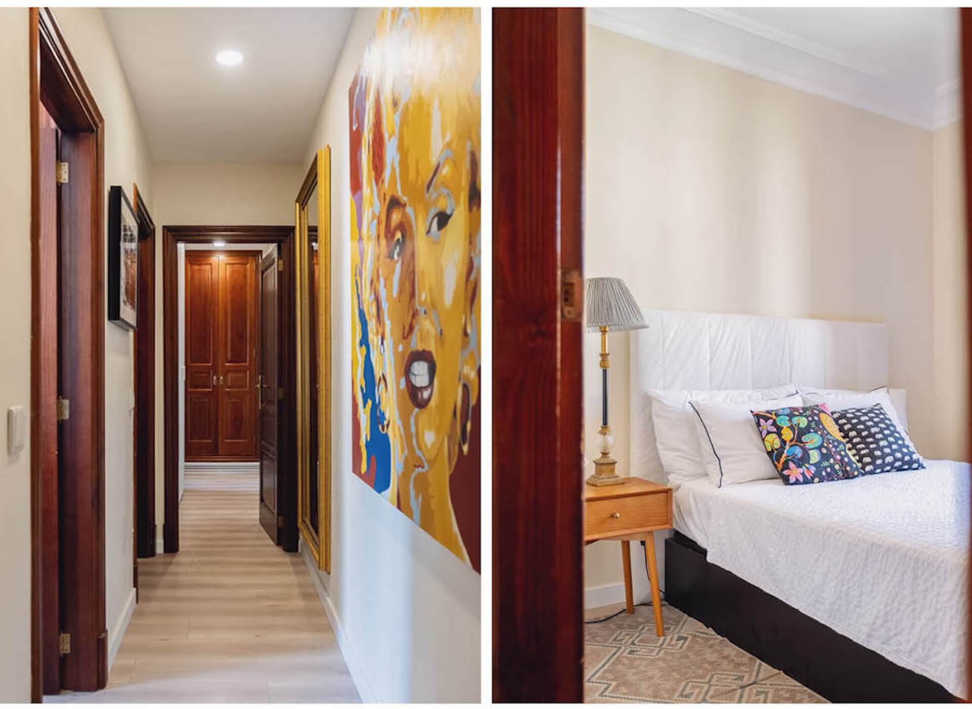 As you step inside, you’re welcomed by the bright living/dining area with a fireplace and high ceilings. The unique large Mallorquin glass windows are bathing the apartment in natural light, creating a very elegant and authentic ambience throughout.