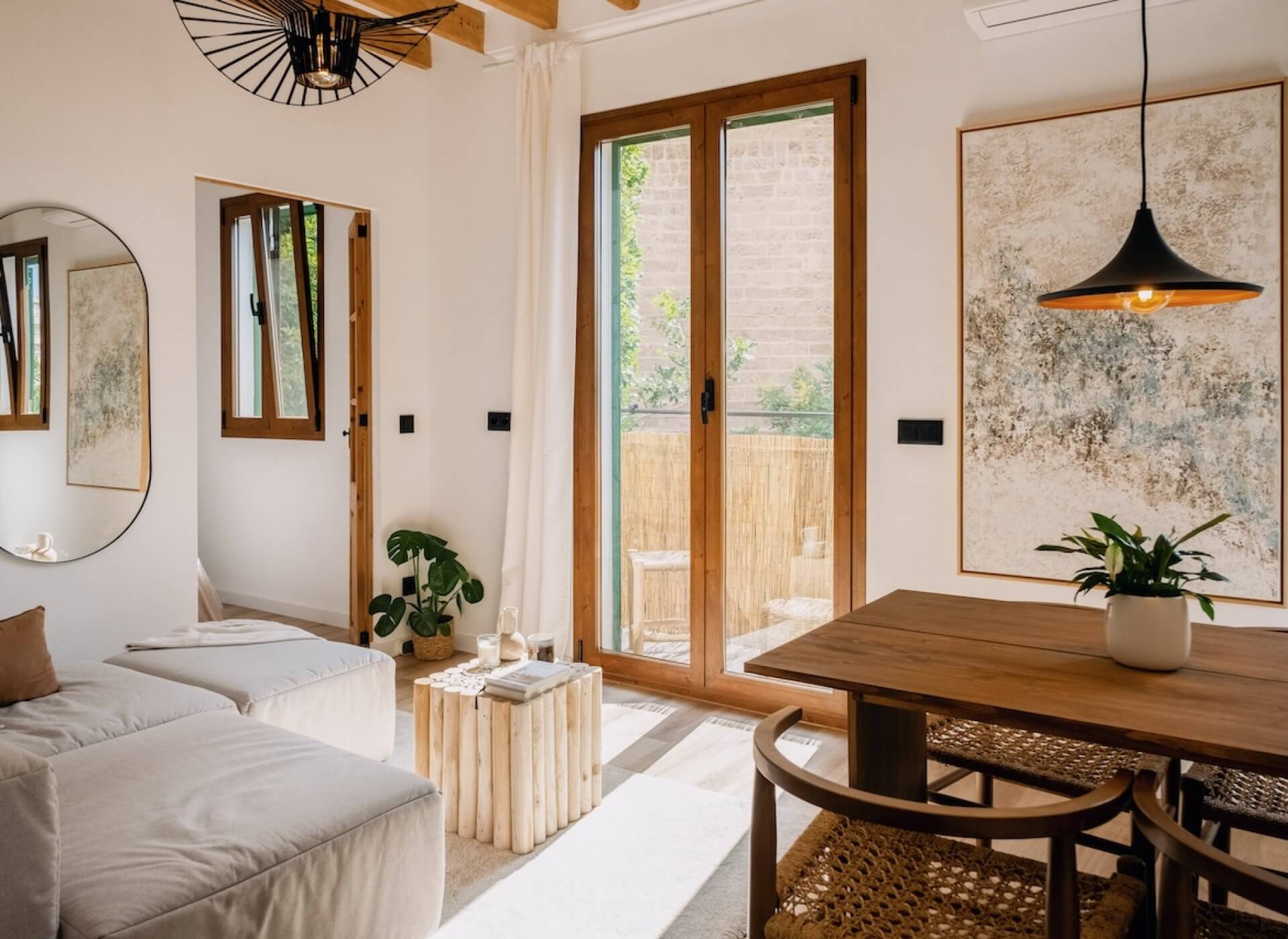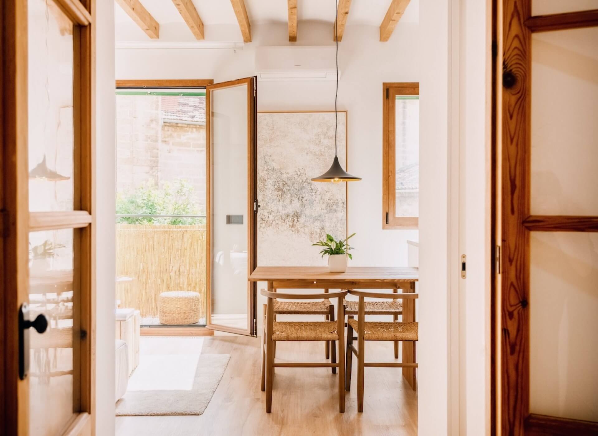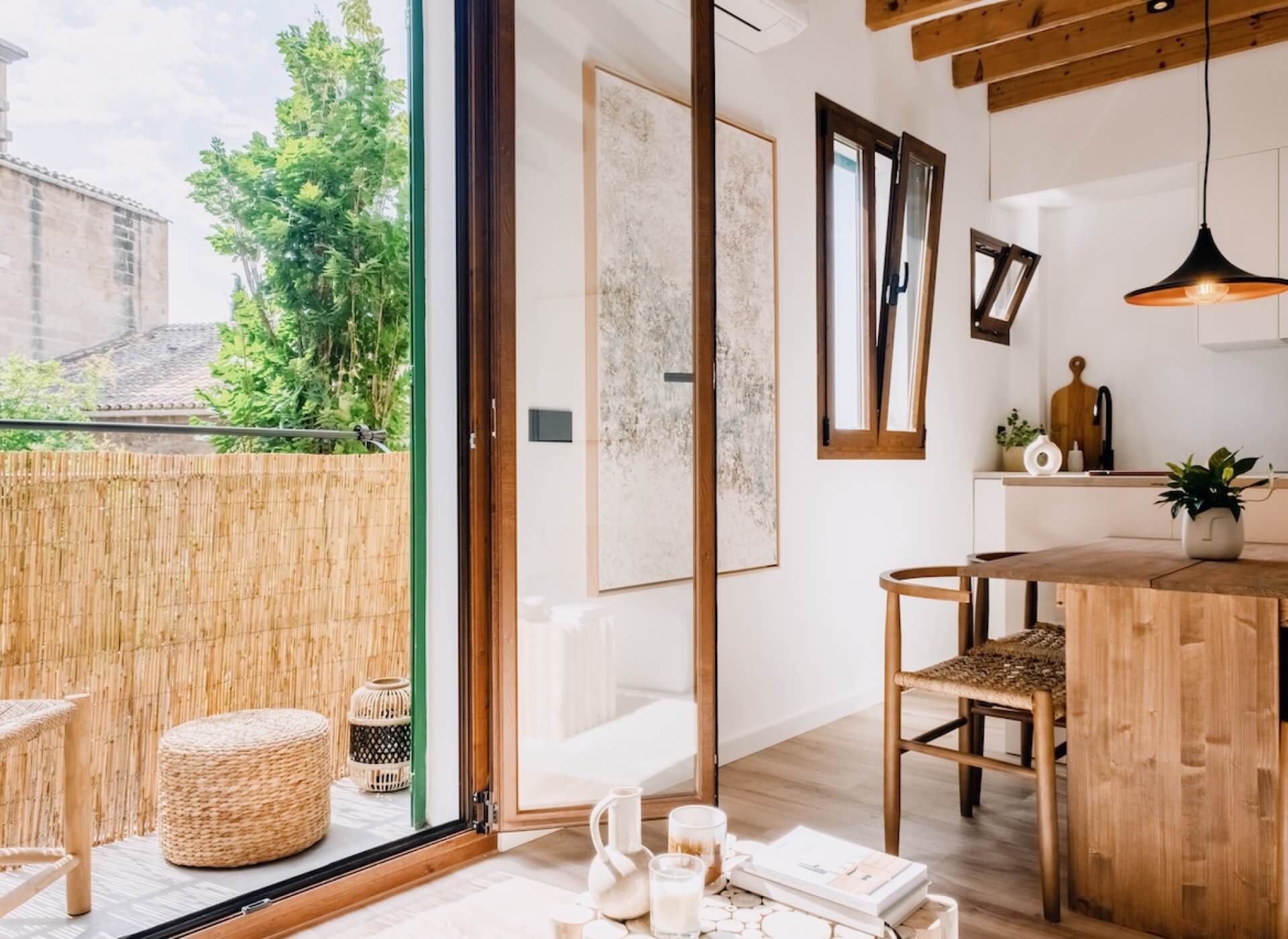 The space offers a very well distribution with an open plan kitchen-living room, beautiful floors, and high ceilings with exposed wooden beams. The space is flooded with natural light throughout all day. The bright living room offers direct access to a traditional Mallorquin balcony with direct church views.