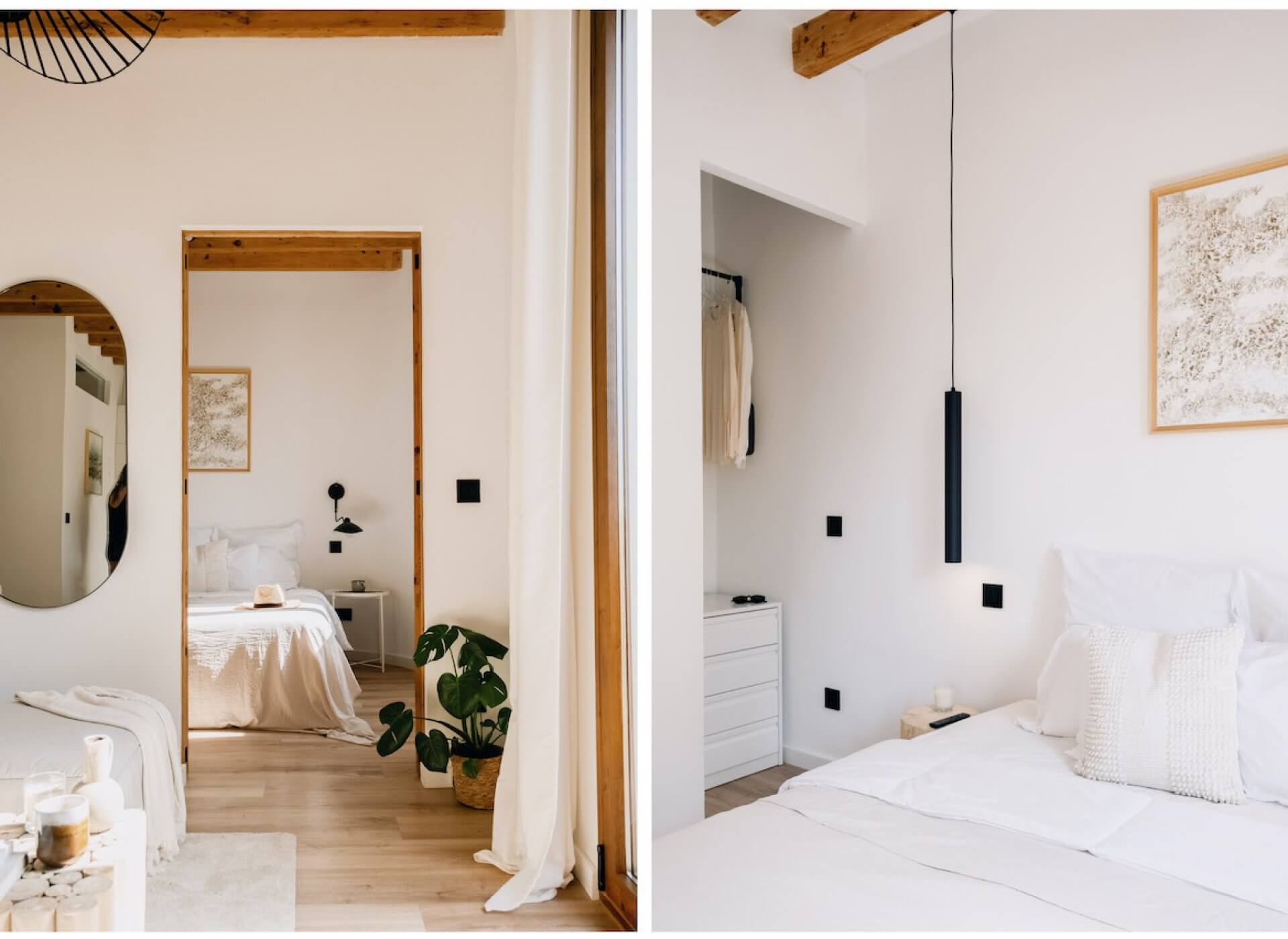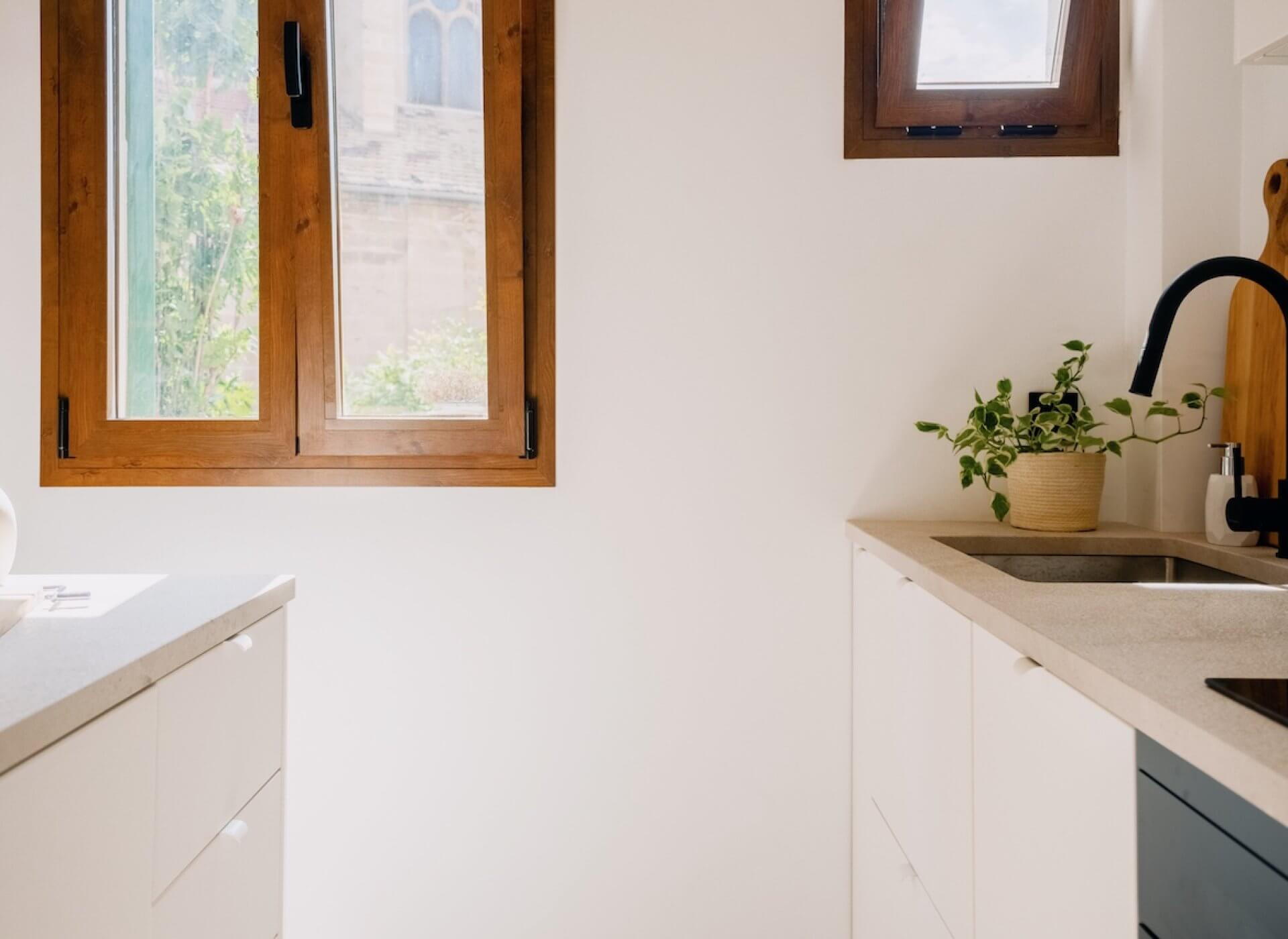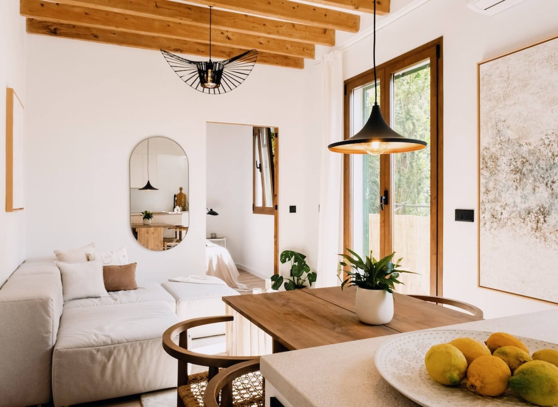 The space offers a very well distribution with an open plan kitchen-living room, beautiful floors, and high ceilings with exposed wooden beams. The space is flooded with natural light throughout all day. The bright living room offers direct access to a traditional Mallorquin balcony with direct church views.
