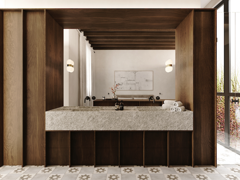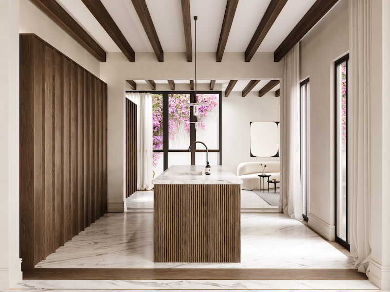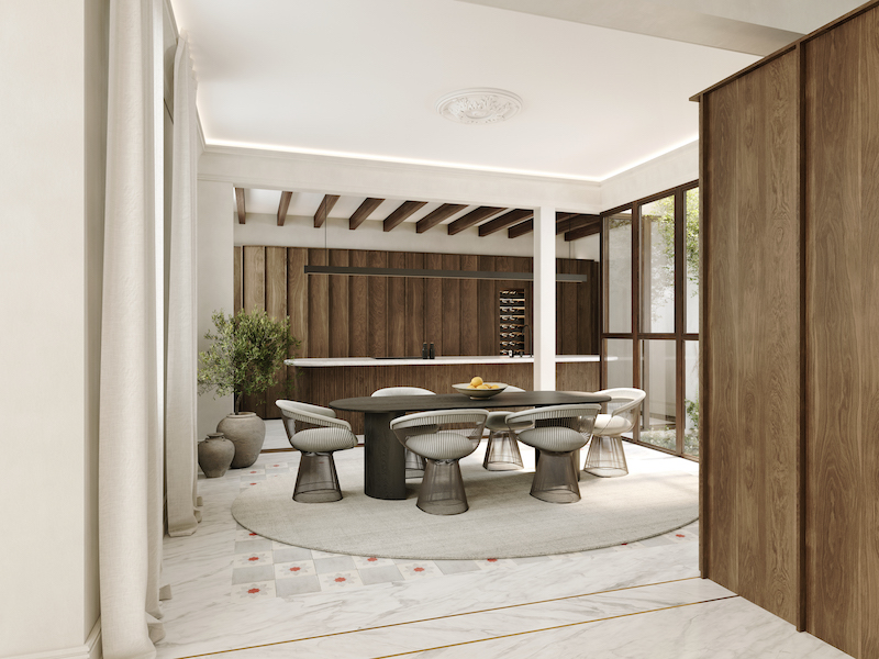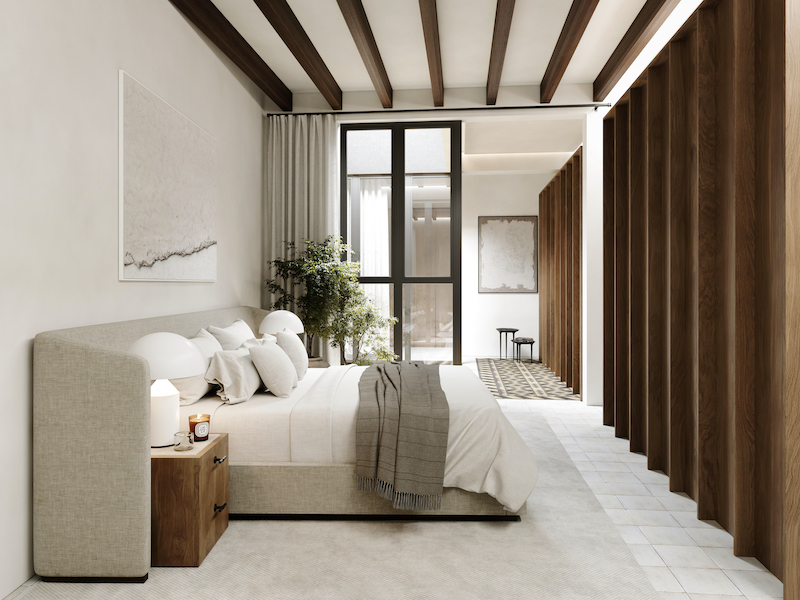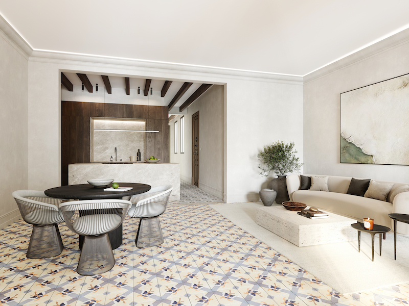 This outstanding three-bedroom, four-bathroom apartment of about 254 sqm built area and a 22m2 patio. There is a large, light-filled living room with antique floor tiles and exposed wooden beams is located at the front of the building, with three balconies overlooking the street. To the rear are two spacious bedrooms with ensuite bathrooms. The master bedroom with built-in wardrobes and Mallorquin tiles on the floors, while the second bedroom has glass-panelled doors to allow light in from the patio. All bathrooms are luxuriously finished in Volakas marble and walnut wood and feature walk-in showers and double vanities with integrated marble sinks. An open concept kitchen, dining and living room wrap around two sides of the central patio. Full height windows facing the courtyard and a light well at the rear bathe this space in natural light.