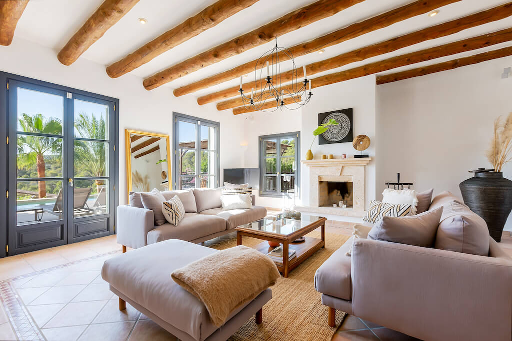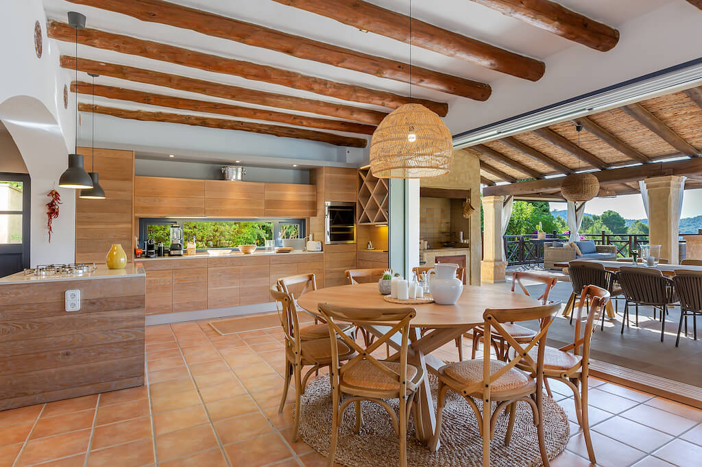 When entering the main house, you are welcomed into a charming hallway that brings you to the bright, open living room. Wooden beams in the ceilings, beautiful stone floors, a fireplace and large windows gives this area a great sense of space. On the same level you will find the large, open kitchen with all latest supplies and panorama doors that can be fully opened towards the covered terrace with a BBQ area. From this floor you have full access to the outside, its easy to step outside to the pool, terrace, or other seating areas. There is also plenty of storage and a guest toilet.